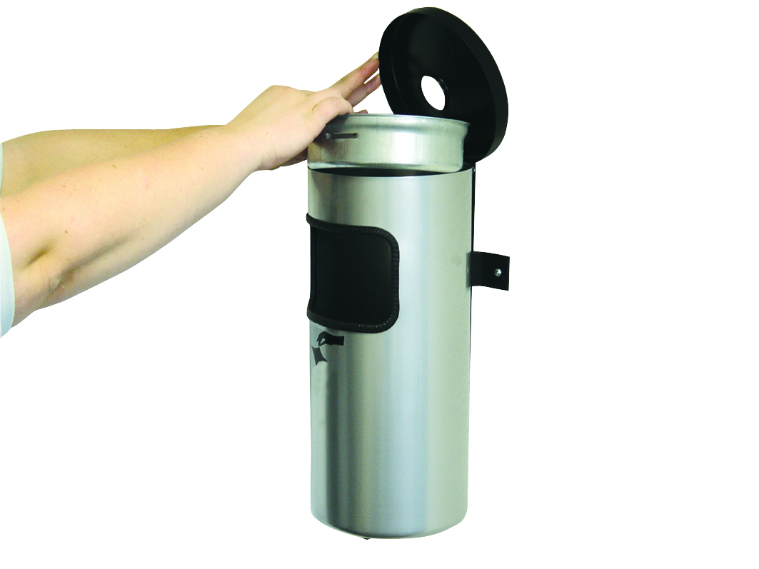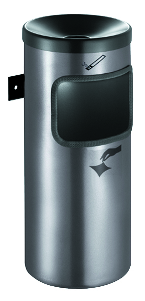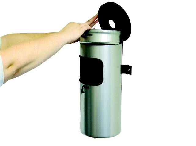 Behälter aus Stahlblech pulverbeschichtet, Deckel matt schwarz beschichtet. Praktische Kippvorrichtung, Asche automatisch glutlöschend, diebstahlsicher, pflegeleicht, robust und formschön.