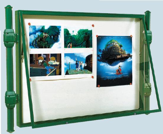 Mitteilungskasten einseitig, aus Aluminiumprofil, Bautiefe 75mm, mit abgerundete Ecken aus Gussaluminium. Ohne Werkzeug und ohne Ausbau des Schaukastens austauschbare Flügeltür oder nach oben klappbare Tür, austauschbar und durch Gasdruckfedern unterstutzt. Integriertes Scharnier. Plexichoc-verglasung, Stärke 4 mm.