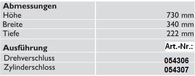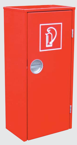 Konstruktion aus rostschutzphosphatiertem Stahlblech, pulverbeschichtet in Rot RAL 3000. Hinweisschild Symbol “Feuerlöschgerät” nach VBG 125 (Größe 148 x 148 mm). Gewicht ca. 9,4 kg. Erhältlich in 2 Ausführungen: mit vertieft liegendem Metalldrehverschluss (mit Plombiervorrichtung) oder mit abschließbarem Zylinderschloss (ohne Plombiervorrichtung) und Notschlüsselfach.
