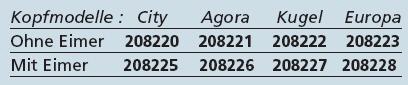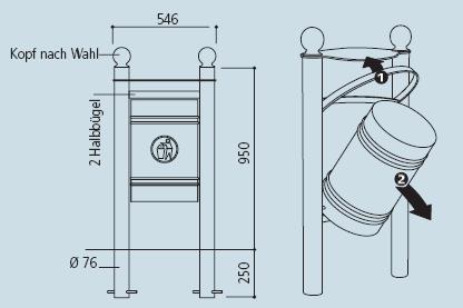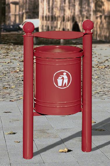 Abfallkörbe auf Fußelementen aus Stahlrohr Ø 76 mit Deckel. 4 Kopfmodelle zur Wahl. Im oberen Teil durch 2 waagerechte Halbbügel aus Flachstahl gehalten, von denen sich einer für das Kippen des Korpus des Abfallkorbs um 45° anheben lässt.