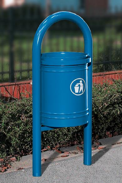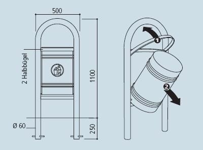 Abfallkorb auf Fußelement aus Stahlrohr Ø 60. Im oberen Teil durch 2 waagerechte