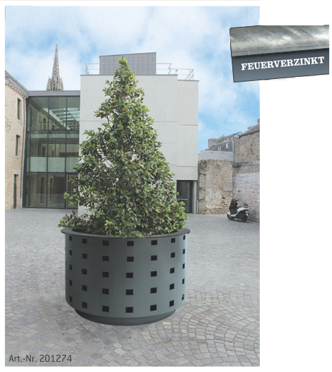 die runde Form und das Design des Lochblechs geben diesem Palmenkasten Eleganz und Robustheit.