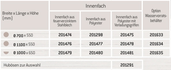 >Wasservorratsbehälter (inkompatibel mit Innenkasten aus feuerverzinktem Stahlblech).