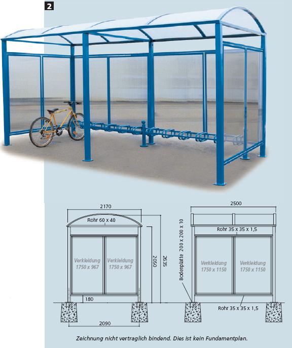 Pfosten aus Stahl 80 x 80, auf Bodenplatten montiert, im oberen Teil mit U-Träger zur Dachhalterung ausgestattet.