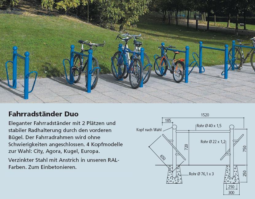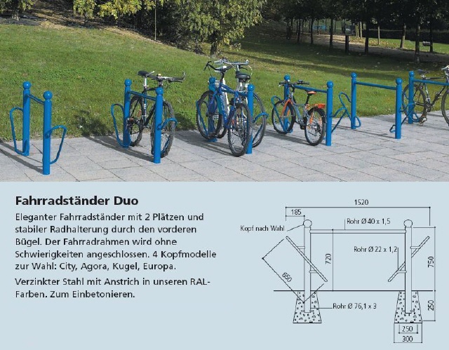 Eleganter Fahrradständer mit 2 Plätzen und stabiler Radhalterung durch den vorderen Bügel. Der Fahrradrahmen wird ohne Schwierigkeiten angeschlossen.