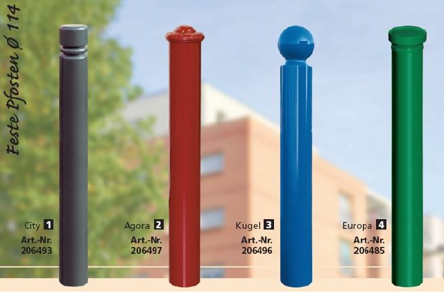 Aus Stahlrohr Ø 114/3,6. Mit dekorativem Kopf aus Stahlguss, geschweißt. Einzeln zu verwenden oder in unsere Straßenmöbel-Linien integrierbar. Gesamthöhe 1200 ohne Kopf. Standardausführung bzw. mit 1 oder 2 geschweißten Ösen.