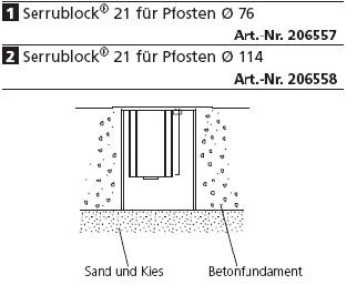 Neu: Die Hülsen“ Serrublock® 21“ für Pfosten sind für die Standard- Pfosten (Feste Pfosten Ø76, Ø114) geeignet.