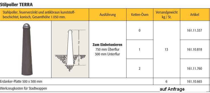 Auf Wunsch auch mit Erdankerplatte 500 x 500 mm, die über den Poller gestülpt wird. Nach leichtem Druck oder Schlag verklemmt sie sich am unteren Ende und übernimmt die Funktion des Erdankers. Diese Ausführung ist zu empfehlen, wenn auf ein Betonfundament verzichtet wird.