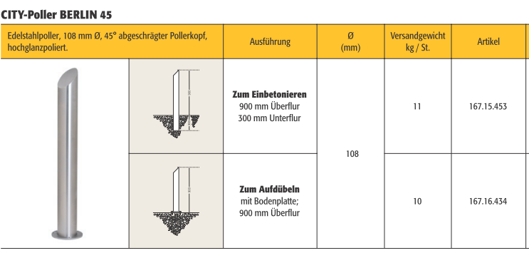 Merkmale für CITY-Poller BERLIN 45 und BERLIN 45K