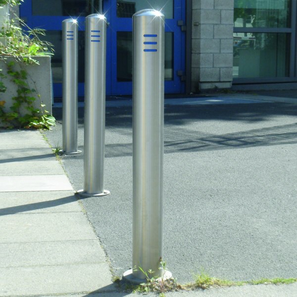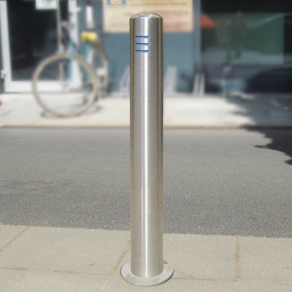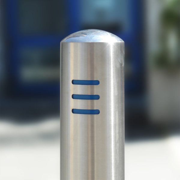 Drei doppelseitige Aussparungen, die von innen schwarz oder hellblau hinterlegt sind, verleihen sportive Eleganz. Der CITY-Poller BERLIN Trend hebt sich damit angenehm von seinem Umfeld ab.
