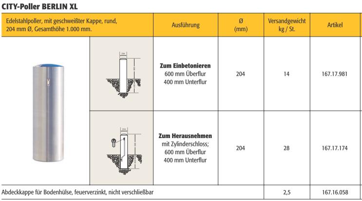 Der CITY-Poller BERLIN XL ist ein sehr stabiler und zugleich formschöner Poller aus hochwertigem Edelstahl - edel und langlebig.