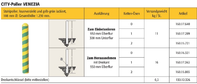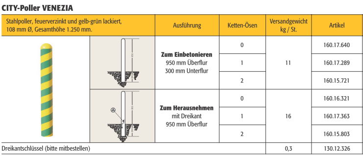 Dieser attraktive Stahlpoller mit geformter Aluminiumkappe wirkt durch seinen leichten, unbeschwerten Charakter auf seine Umgebung. Vielfältige Farbspiele geben dem Stadtplaner zusätzliche Optionen. 108 Ø / 1.250 / 2,9 mm davon 950 mm Überflur. Feuerverzinkt. Zusätzlich mit schmalen gelb-grünen Diagonalstreifen lackiert. Andere RAL-Farbtöne auf Anfrage.