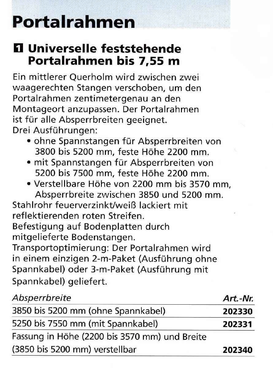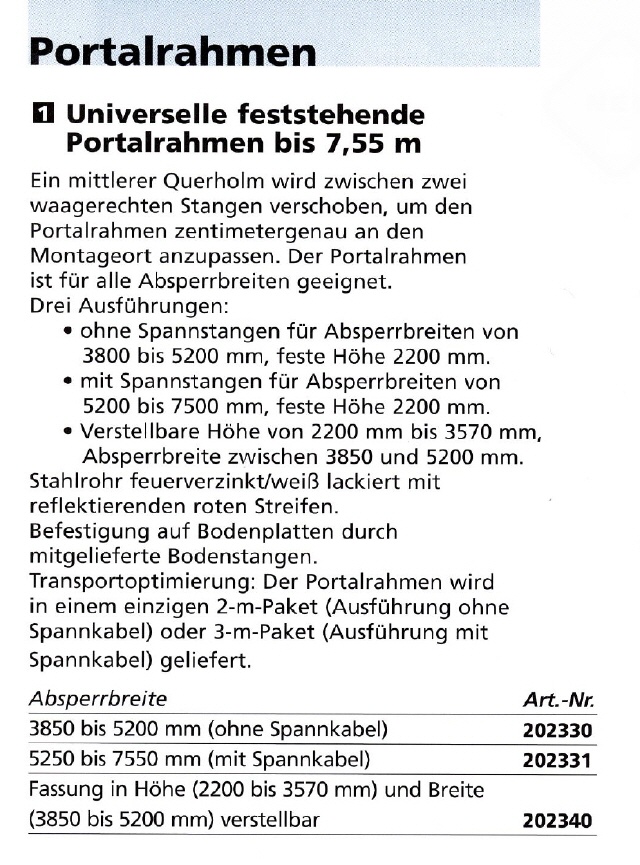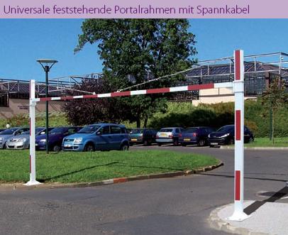 Ein mittlerer Querholm wird zwischen zwei waagerechten Stangen verschoben, um den Portalrahmen zentimetergenau an den Montageort anzupassen. Der Portalrahmen ist für alle Absperrbreiten geeignet.