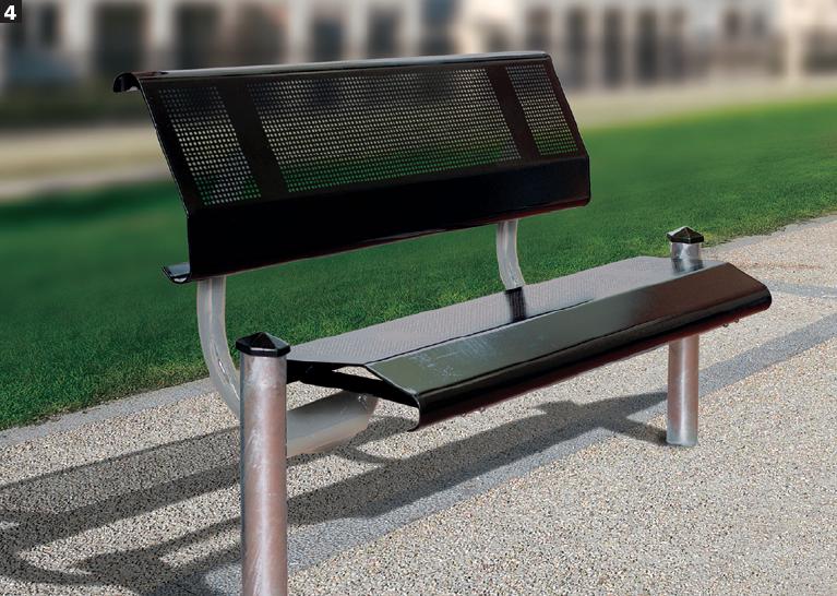 Fußelemente aus Stahlrohr Ø 76. Sitz und Rückenlehne aus 2,5-mm-Stahllochblech, flachgedrückte Falten und abgerundete Sicherheitskanten an den Enden.