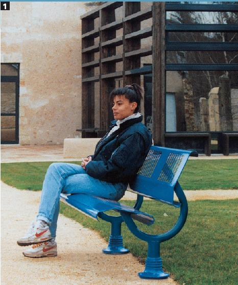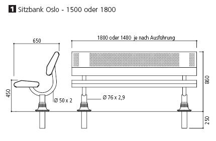 Fußelemente aus Stahlrohr Ø 76. Sitz und Rückenlehne aus 2,5-mm-Stahllochblech, flachgedrückte Falten und abgerundete Sicherheitskanten an den Enden.