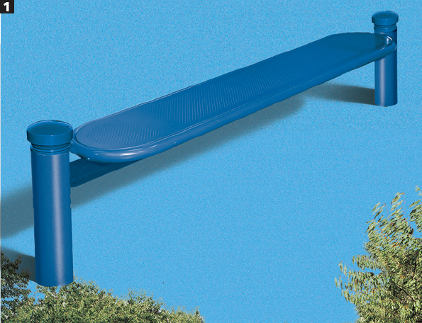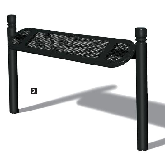 Fußelemente aus Stahlrohr Ø 114 für die Bänke und Ø 76 für die Standlehnen.