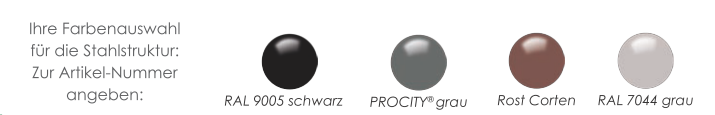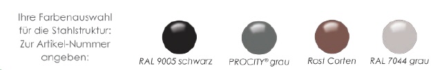 Bestimmen Sie die gewünschte Artikelnummer und wählen Sie diese unten bei "Welche Artikelnummer?" aus. Der Preis ändert sich automatisch! --------------------------------------------------------------------------------- Eine unten aufgeführte Farbe des Stahls bitte am Ende der Bestellung in der Bemerkung angeben. |