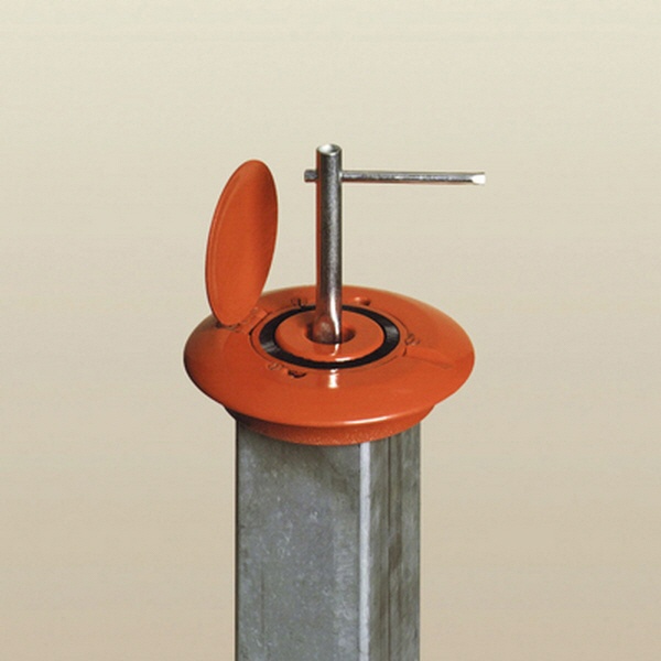 Nach Entriegeln mit Dreikantschlüssel hebt die Gasdruckfeder das Oberteil selbsttätig aus der Bodenhülse. Nach leichtem Anheben verriegelt der Pfosten automatisch. Versenkt wird das entriegelte Oberteil durch einfaches Niederdrücken.