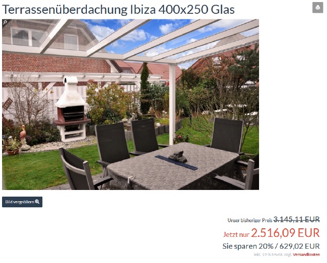 Produktbeschreibung Terrassenüberdachung IBIZA Glas Art.-Nr.: Ibiza400x250Glas Beschreibung: ● Pulverbeschichtetes Aluminium gemäß EN 755 ● Dach VSG Sicherheitsglas 8 mm in Klar ( Milchglas mit Mehrkosten ). ● Absolut ebenes Dach, Sparren innenliegend. ● Oben hochwertige Abdeckleisten aus hochwertigem Aluminium, keine Gummiabdeckung. ● Pfosten eckig 110x110 mm. ● Regenrinne innenliegend, nicht sichtbar von außen. ● Regenrinne 14 cm hoch für eine elegante Optik. ● Regenrinne Standard 3 mm stark. ● Nicht sichtbares Wasserablaufrohr in einem Pfosten. ● Aluminium Wandschiene auf voller Länge. ● Komplett mit Zubehör. ● Bodenbefestigung im Preis nicht enthalten, optional bei uns erhältlich ● Eigene Montage sehr leicht zu machen. ● Montagevideo wird auf Wunsch per Mail geschickt. ● Alle Teile sind fertig zugeschnitten. ● Ausbaufähig zu einem kompletten Gartenzimmer. ● Viele verschiedene Seitenwände in Glas, Stegplatten, WPC-Planken und Aluminium-Planken lieferbar. ● 10 Jahre Garantie auf das Gestell. ● 10 Jahre Garantie auf die Farbe. ● Lieferbar ohne Mehrkosten in den Farben: weiss & anthrazitgrau. ● Versandkosten bei Angebotsanforderung! |