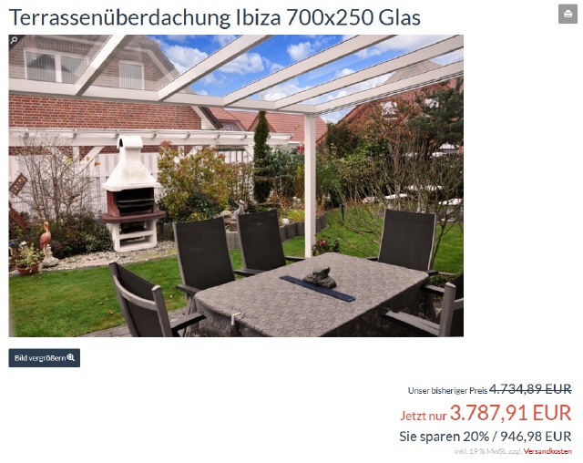 Produktbeschreibung Terrassenüberdachung IBIZA Glas Art.-Nr.: Ibiza700x250Glas Beschreibung: ● Pulverbeschichtetes Aluminium gemäß EN 755 ● Dach VSG Sicherheitsglas 8 mm in Klar ( Milchglas mit Mehrkosten ). ● Absolut ebenes Dach, Sparren innenliegend. ● Oben hochwertige Abdeckleisten aus hochwertigem Aluminium, keine Gummiabdeckung. ● Pfosten eckig 110x110 mm. ● Regenrinne innenliegend, nicht sichtbar von außen. ● Regenrinne 14 cm hoch für eine elegante Optik. ● Regenrinne Standard 3 mm stark. ● Nicht sichtbares Wasserablaufrohr in einem Pfosten. ● Aluminium Wandschiene auf voller Länge. ● Komplett mit Zubehör. ● Bodenbefestigung im Preis nicht enthalten, optional bei uns erhältlich ● Eigene Montage sehr leicht zu machen. ● Montagevideo wird auf Wunsch per Mail geschickt. ● Alle Teile sind fertig zugeschnitten. ● Ausbaufähig zu einem kompletten Gartenzimmer. ● Viele verschiedene Seitenwände in Glas, Stegplatten, WPC-Planken und Aluminium-Planken lieferbar. ● 10 Jahre Garantie auf das Gestell. ● 10 Jahre Garantie auf die Farbe. ● Lieferbar ohne Mehrkosten in den Farben: weiss & anthrazitgrau. ● Versandkosten bei Angebotsanforderung! |