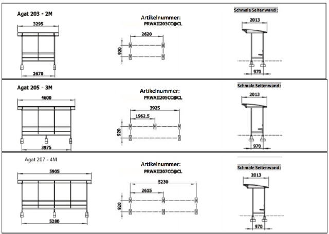 Agat ist eine preiswerte Überdachung in top Qualität, die sowohl als Buswartehaus, als auch als Überdachung für Fahrräder dienen kann. Die Ausführung bietet eine modulare Bauweise sowie eine Auslieferung für verschiedenen Schneelasten, in Standard RAL-Farben und vielfältigen Ausstattungen. Auch Werbeflächen können als Seiten- oder Rückwand eingebaut werden. Ein Abfallbehälter ist integrierbar und rundet das Design ab. Auch ein Solarmodul für die Beleuchtung kann optional eingebaut werden.
