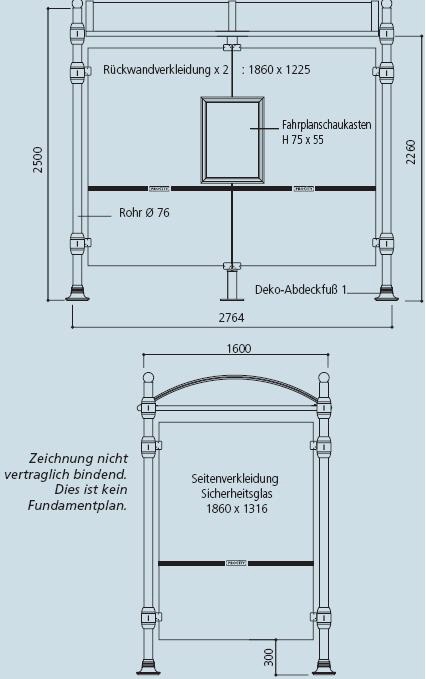 Achtung: Nicht alle Bank-Abmessungen sind mit unseren Wartehallen mit Infovitrine kompatibel. Die Länge der Bank überprüfen: Es muss ein Abstand von mindestens 1 Meter zur Informationsvitrine eingehalten